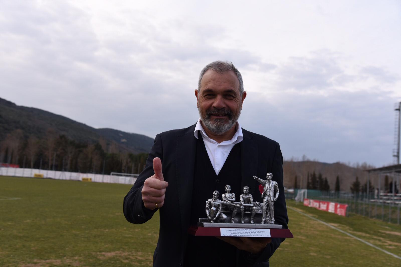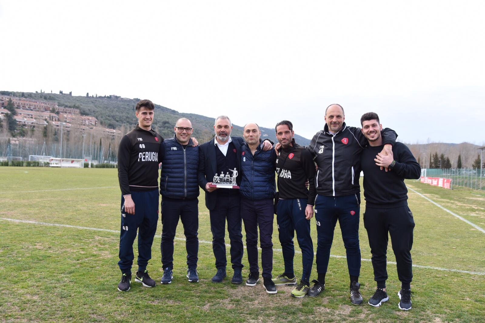 Il tecnico della Primavera del Perugia ha tagliato il prestigioso traguardo e ha ricevuto un trofeo celebrativo in occasione del match odierno a Pian di Massiano.