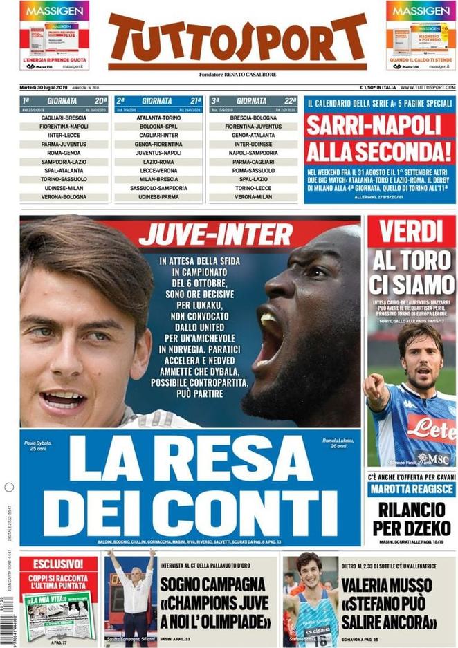 Le prime pagine dei quotidiani sportivi del 30-07-2019