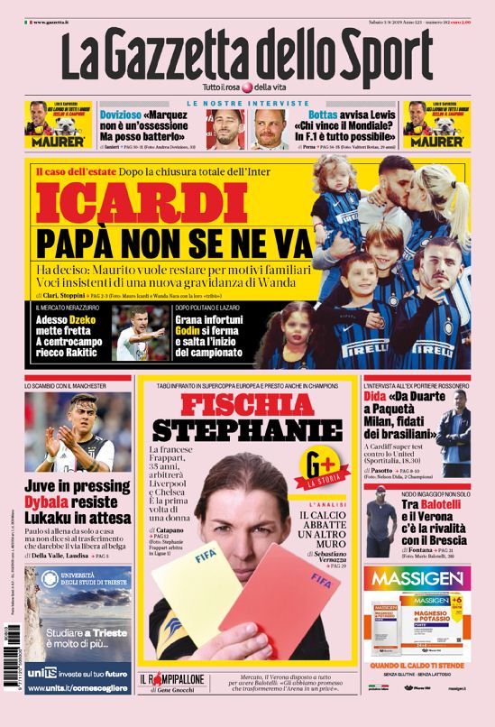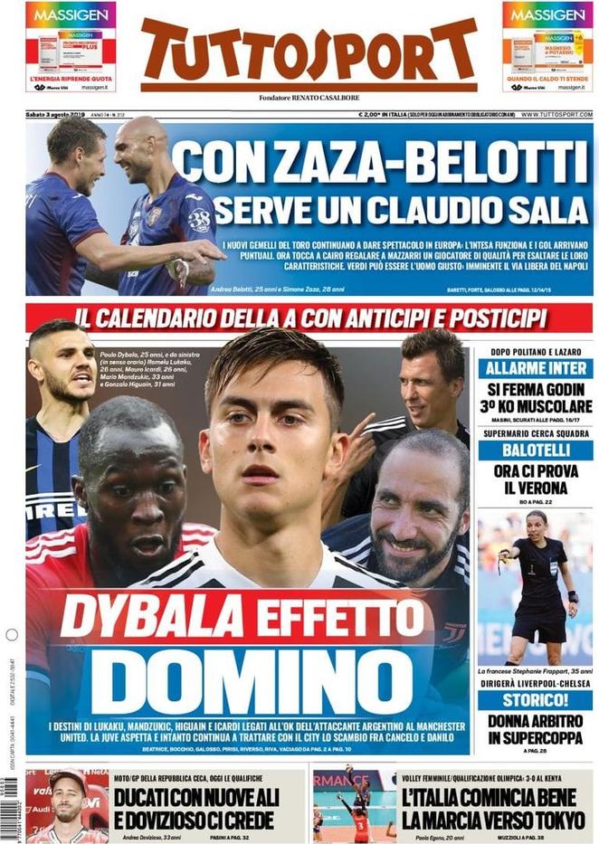 Le prime pagine dei quotidiani sportivi del 03-08-2019