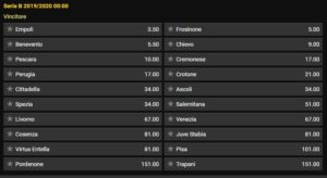 Al quarto posto c’è il Chievo (8.00 o 9.00), il primo avversario dei grifoni il prossimo 25 agosto al Curi. Davanti al Perugia c’è anche il Pescara (12.00 o 10.00). In linea generale saranno le neopromosse, secondo i bookmakers, ad accendere la lotta salvezza.