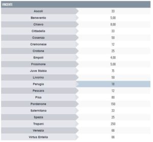 Le quote di due delle principali agenzie di scommesse piazzano il Grifo in linea con Cremonese e Pescara. Davanti ci sono Empoli, Frosinone, Benevento e Chievo.