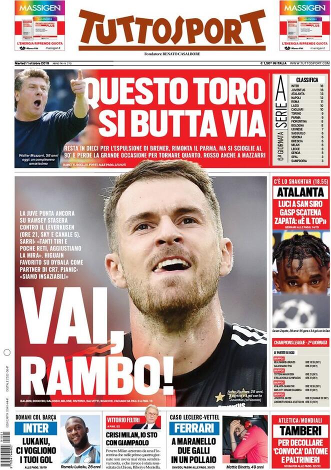 Le prime pagine dei quotidiani sportivi del 01-10-2019