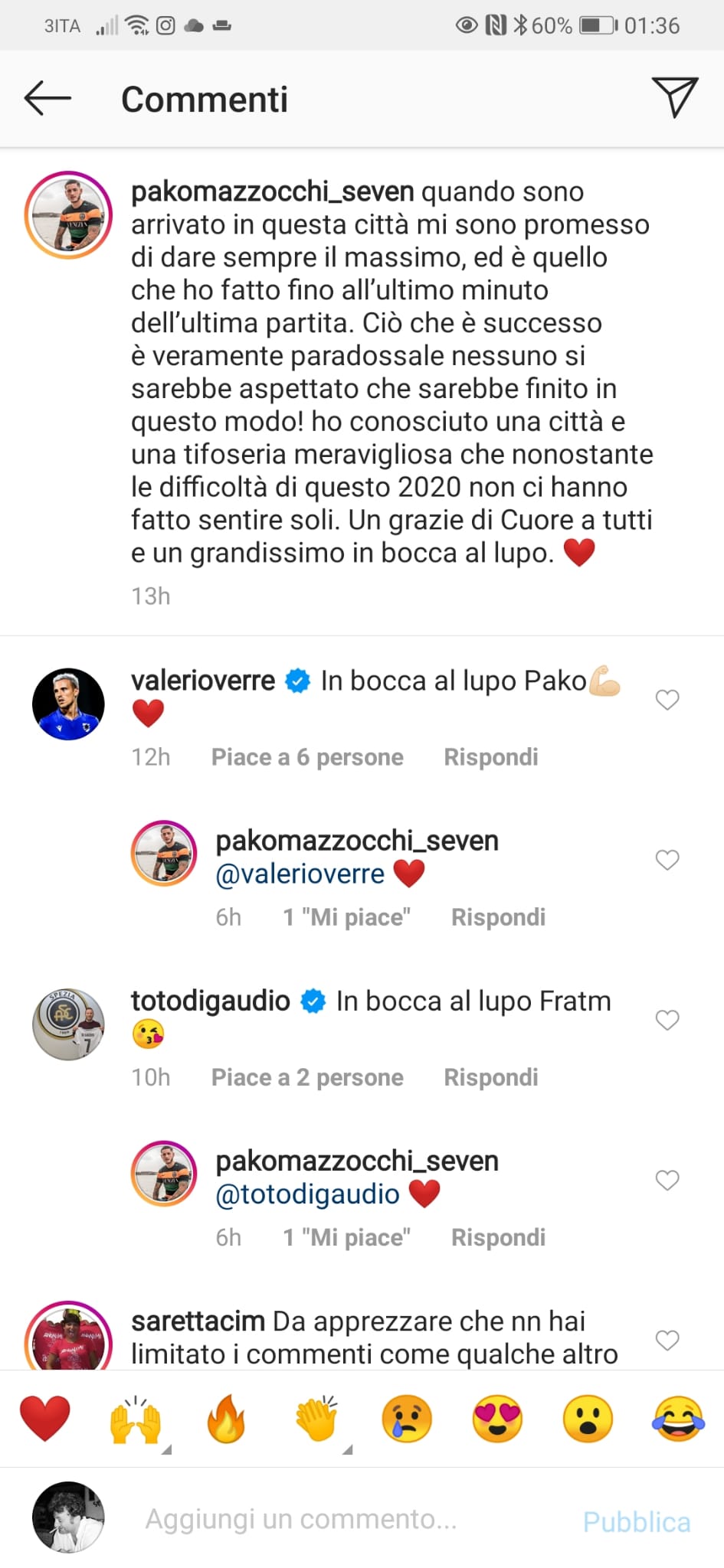 ‘Quando sono arrivato in questa città mi sono promesso di dare sempre il massimo ed è quello che ho fatto fino all’ultimo minuto dell’ultima partita. Ciò che è successo è veramente paradossale, nessuno si sarebbe aspettato che sarebbe finita in questo modo! Ho conosciuto una città e una tifoseria meravigliose che nonostante le difficoltà di questo 2020 non ci hanno fatto sentire soli. Un grazie di cuore a tutti e un grandissimo in bocca al lupo’.