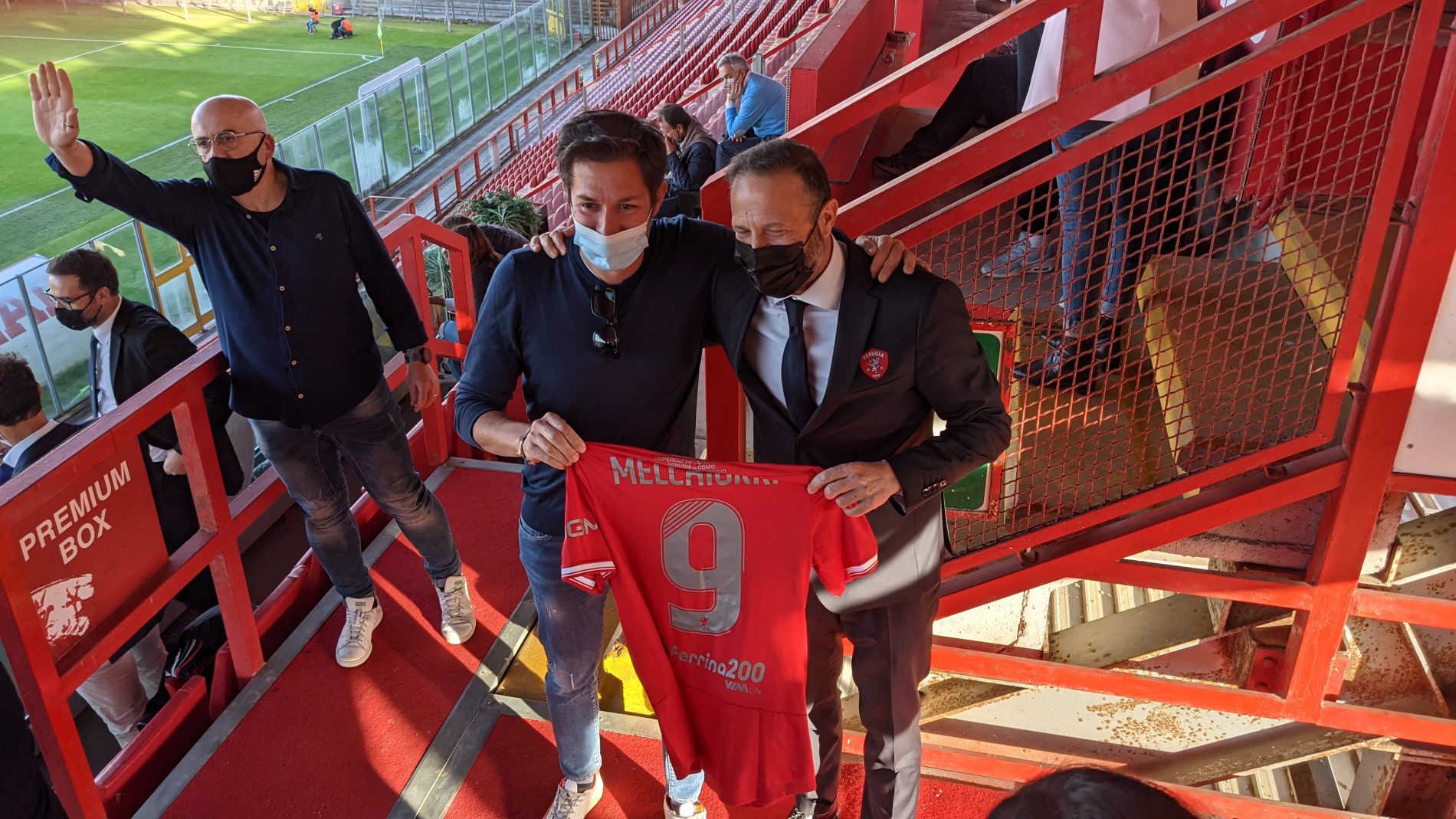 Dal sindaco Andrea Romizi al presidente del Cru Luigi Repace, in tribuna al Curi ospiti del patron Santopadre con tanto di maglie dei simboli della stagione della promozione biancorossa