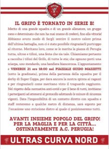 I gruppi organizzati invitano i supporters biancorossi a incontrarsi nel piazzale Guido Mazzetti prima della partenza dei grifoni per Terni
