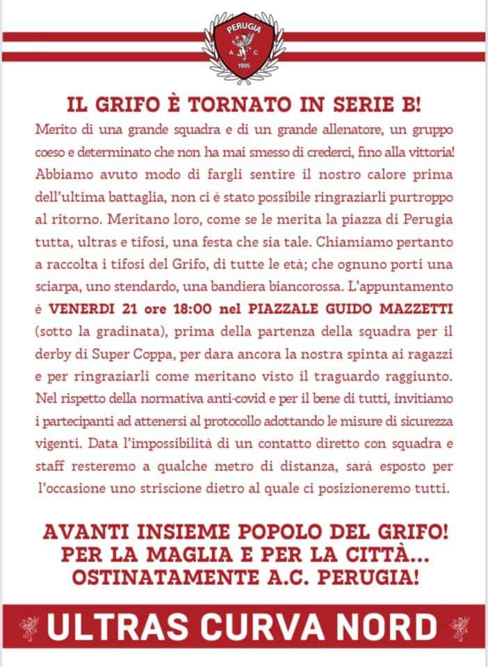Che festa sia. Il 2 maggio i tifosi biancorossi si erano riversati per le strade di Perugia mentre i grifoni festeggiavano negli spogliatoi di Salò. Al rientro in pullman, a mezzanotte inoltrata, i supporter non avevano potuto attendere gli eroi della cavalcata vincente per rispetto del coprifuoco. Ora la Nord dà appuntamento a venerdì alle 18, prima della partenza per quella che diventa la sfida dell’anno in casa della Ternana, per ringraziare “una grande squadra e un grande allenatore”.