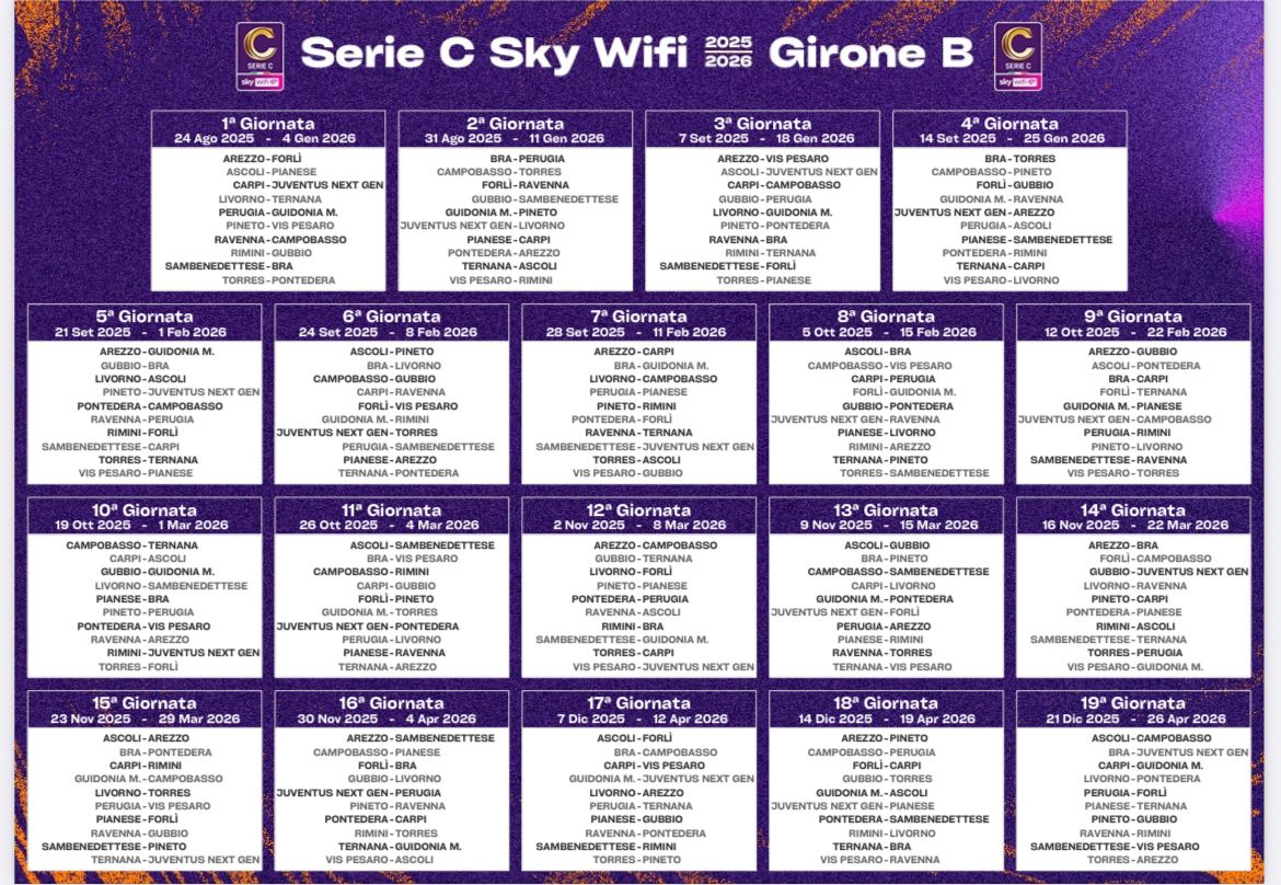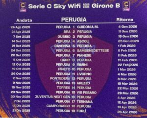 Esordio al Curi contro la neopromossa Guidonia Montecelio per il nuovo Perugia il 24 agosto, prima trasferta a Sestri contro il Bra nel turno successivo. Terza giornata Il 7 settembre con tanto di derby a Gubbio, seconda gara casalinga invece contro l’Ascoli nel primo big-match. Ancora derby: Perugia-Arezzo è in programma alla 13a giornata il 9 novembre, mentre Perugia-Ternana sarà disputata al Curi il 7 dicembre per la 17a giornata, con ritorno il 12 aprile a Terni. Chiusura di campionato a Forlì il 25 aprile 2026. In sostanza un calendario piuttosto interessante per i grifoni, che nelle prime sei giornate avranno quattro neopromosse (Guidonia, Bra, Ravenna e Sambenedettese) e dunque l’occasione per una partenza lanciata.