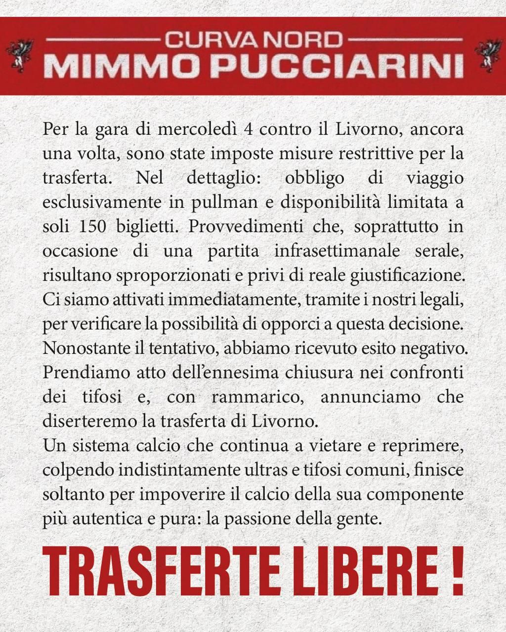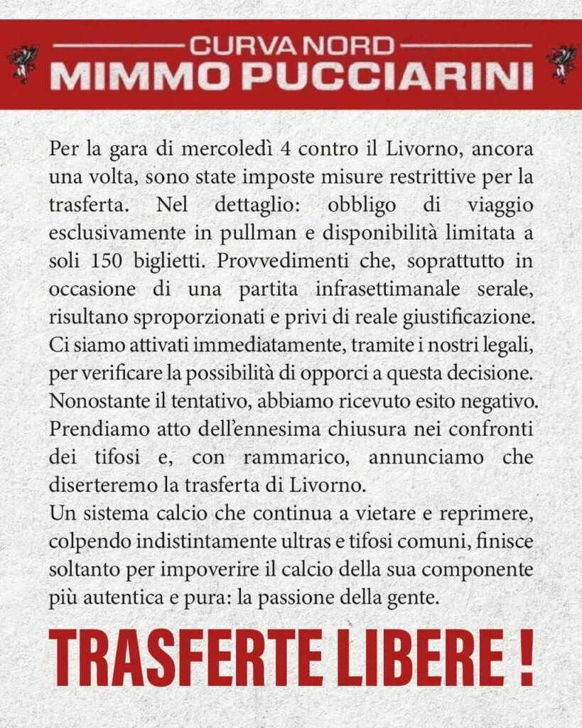 “Per la gara di mercoledì 4 contro il Livorno, ancora una volta sono state imposte misure restrittive per la trasferta. Nel dettaglio obbligo di viaggio esclusivamente in pullman e disponibilità limitata a soli 150 biglietti. Provvedimenti che, soprattutto in occasione di una partita infrasettimanale serale, risultano sproporzionati e privi di reale giustificazione. Ci siamo attivati immediatamente, tramite i nostri legali, per verificare la possibilità di opporci a questa decisione. Nonostante il tentativo, abbiamo ricevuto esito negativo. Prendiamo atto dell’ennesima chiusura nei confronti dei tifosi e, con rammarico, annunciamo che diserteremo la trasferta di Livorno. Un sistema calcio che continua a vietare e reprimere, colpendo indistintamente ultras e tifosi comuni, finisce soltanto per impoverire il calcio della sua componente più autentica e pura: la passione della gente. Trasferte libere!”.