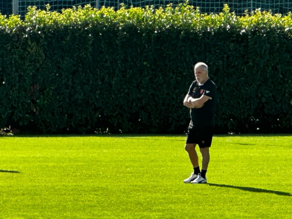Nell'allenamento a porte aperte il neo tecnico biancorosso ha schierato Kanoute accanto a Montevago in un attacco a due...